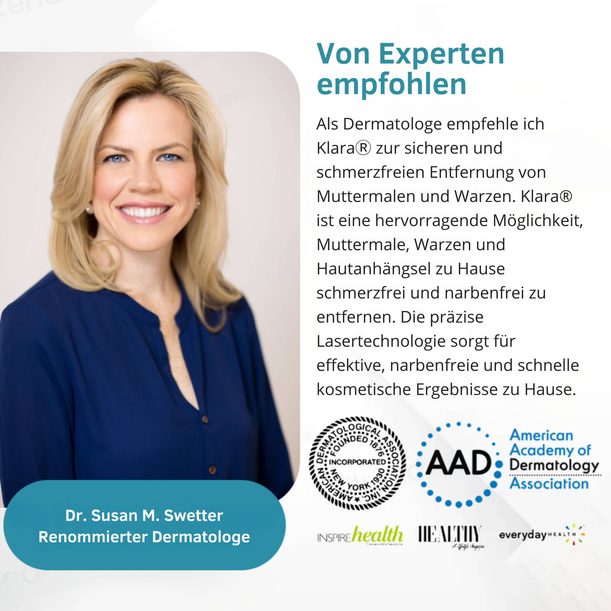 Stellen Sie sich vor, Sie wachen mit makelloser Haut auf, während hartnäckige Muttermale, Warzen und Hautanhängsel einfach verschwinden – alles bequem von zu Hause aus. Klara™ nutzt modernste, von der FDA zertifizierte CO₂-Laser-Technologie, um Makel sicher und schmerzfrei zu entfernen. Sehen Sie schon nach zwei Wochen eine deutliche Veränderung, ohne teure Arztbesuche oder invasive Eingriffe. Fühlen Sie sich wieder selbstbewusst und stolz auf Ihre Haut – schnell, mühelos und schmerzfrei.